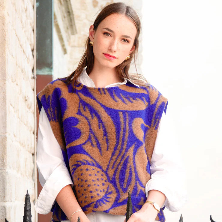 Een zachte winterstof in een mix van wol & polyester. De stof heeft een grote artistieke bloemenprint in koningsblauw en bruin.