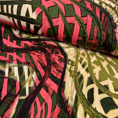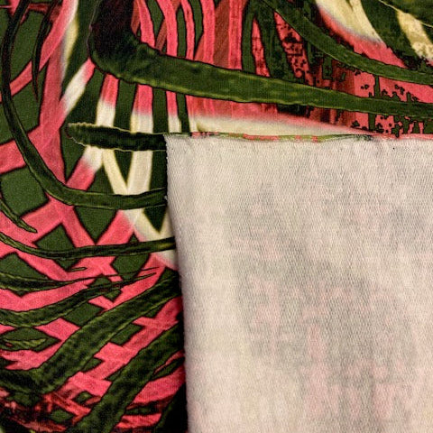 Een zachte french terry of sweater stof met een abstracte print en aan de binnenzijde is de stof opgeruwd en dit geeft aangenaam gevoel