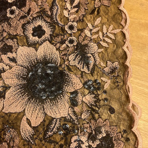 Een soepele kant met bloemen en pailetten met afgewerkte rand ideaal voor het naaien van top,( london top) lange rok, kleed, of losse broek