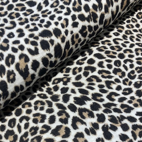Een dierenprint op een ecru achtergrond , ideaal om een bloesje, short of zomers jurkje van te maken.